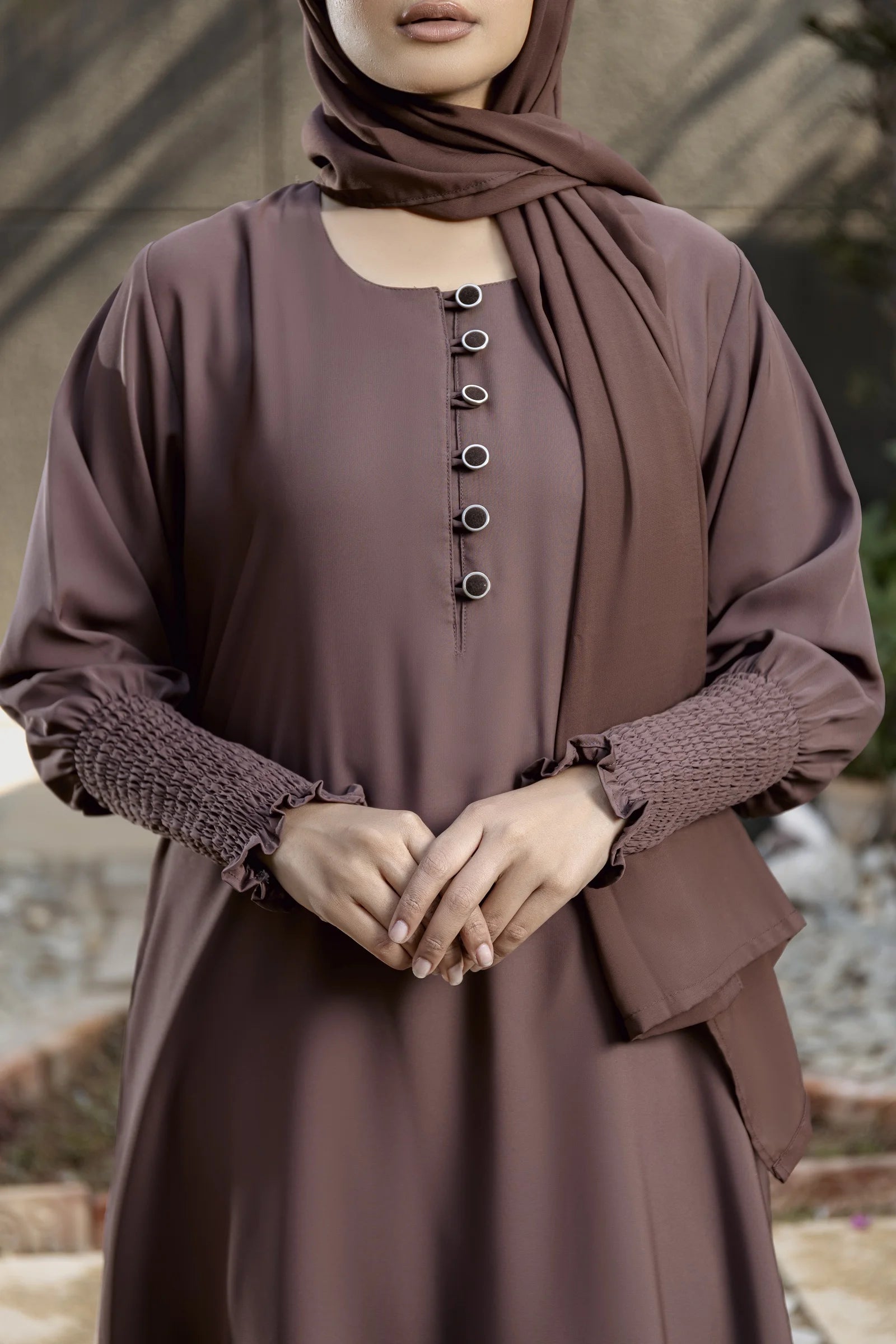 Abannah Abaya: Basic abaya with fancy sleeves & buttons on front, matching shiela included.