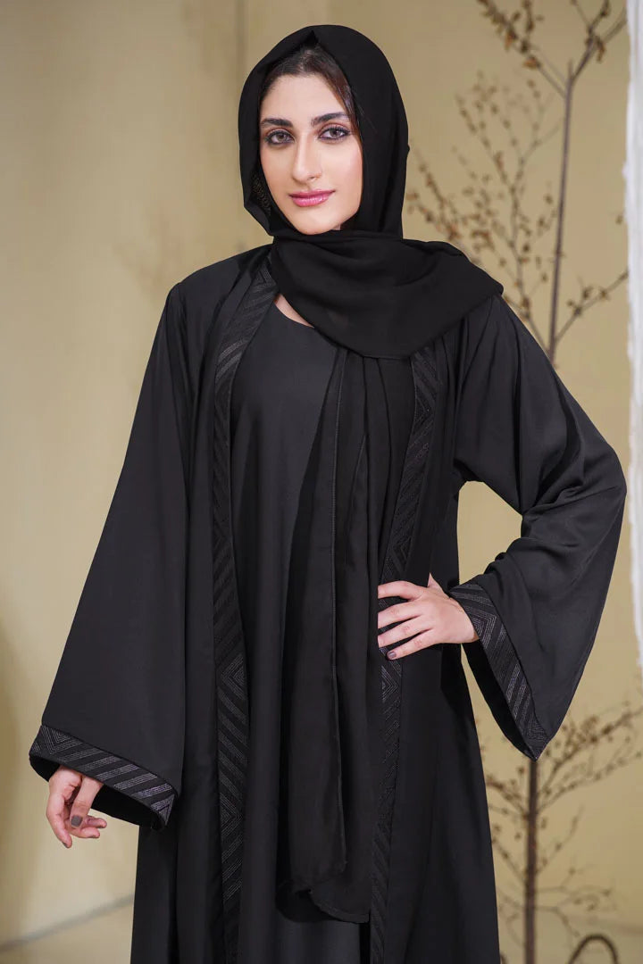 Attached inner Embroidery Abaya: Black elegant abaya with attached inner and same color embroidery on front making it perfect for evening events.