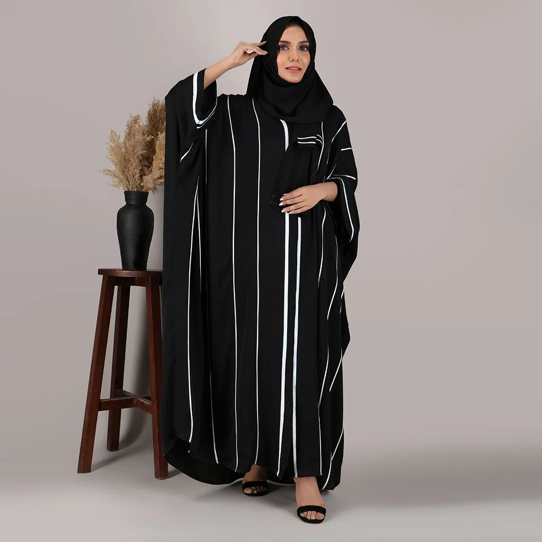 Black/White Charisma–Simple Black Color Abaya With White Stripes, Good for casual use . Matching Hijab Included.