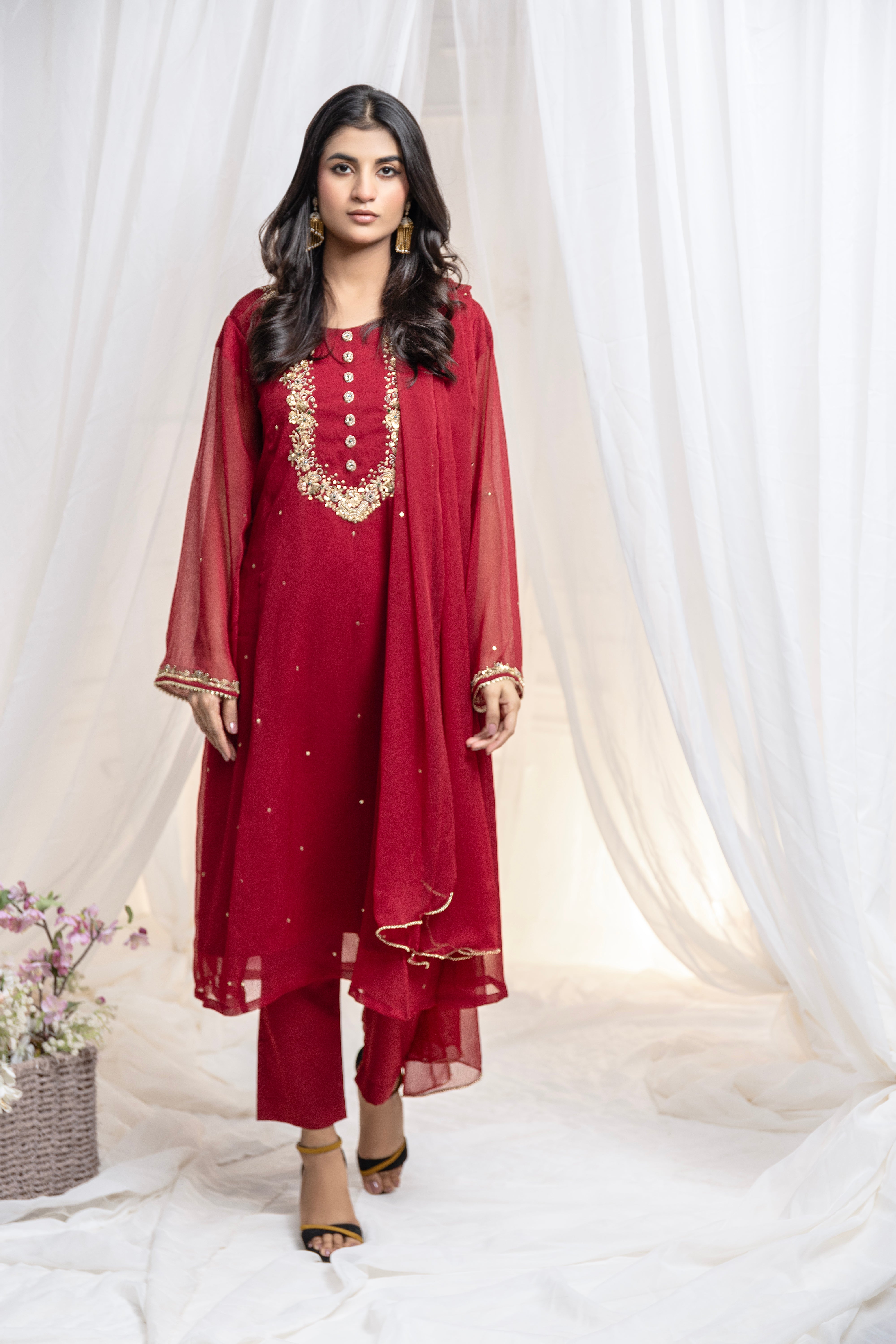 Elevate your wardrobe with our exquisitely crafted Gulnaar Kora Dabka Jora. This stunning stitched reddish maroon suit is adorned with intricate Kora Dabka work, offering a perfect blend of traditional craftsmanship and contemporary style. The rich reddish maroon hue symbolizes passion and elegance, while the detailed embellishments add a touch of opulence, making it an ideal choice for festive occasions and celebrations. The premium quality fabric ensures comfort and a flattering fit, allowing you to make a statement wherever you go.