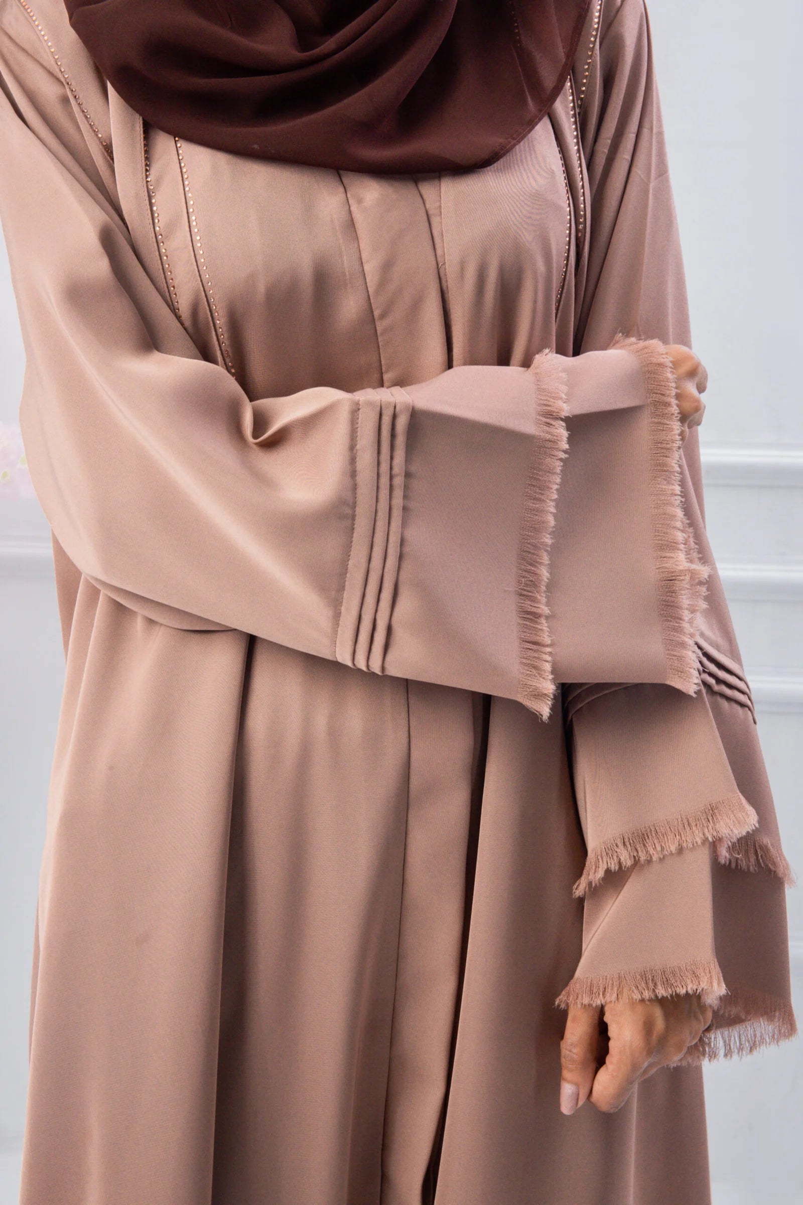 Discover timeless elegance with our beige front-open abaya, crafted from luxurious Nidah fabric. Designed with pleated and ruffled sleeves, this abaya exudes sophistication and grace. Perfect for any occasion, its soft color and intricate details make it a versatile and stylish addition to your wardrobe.