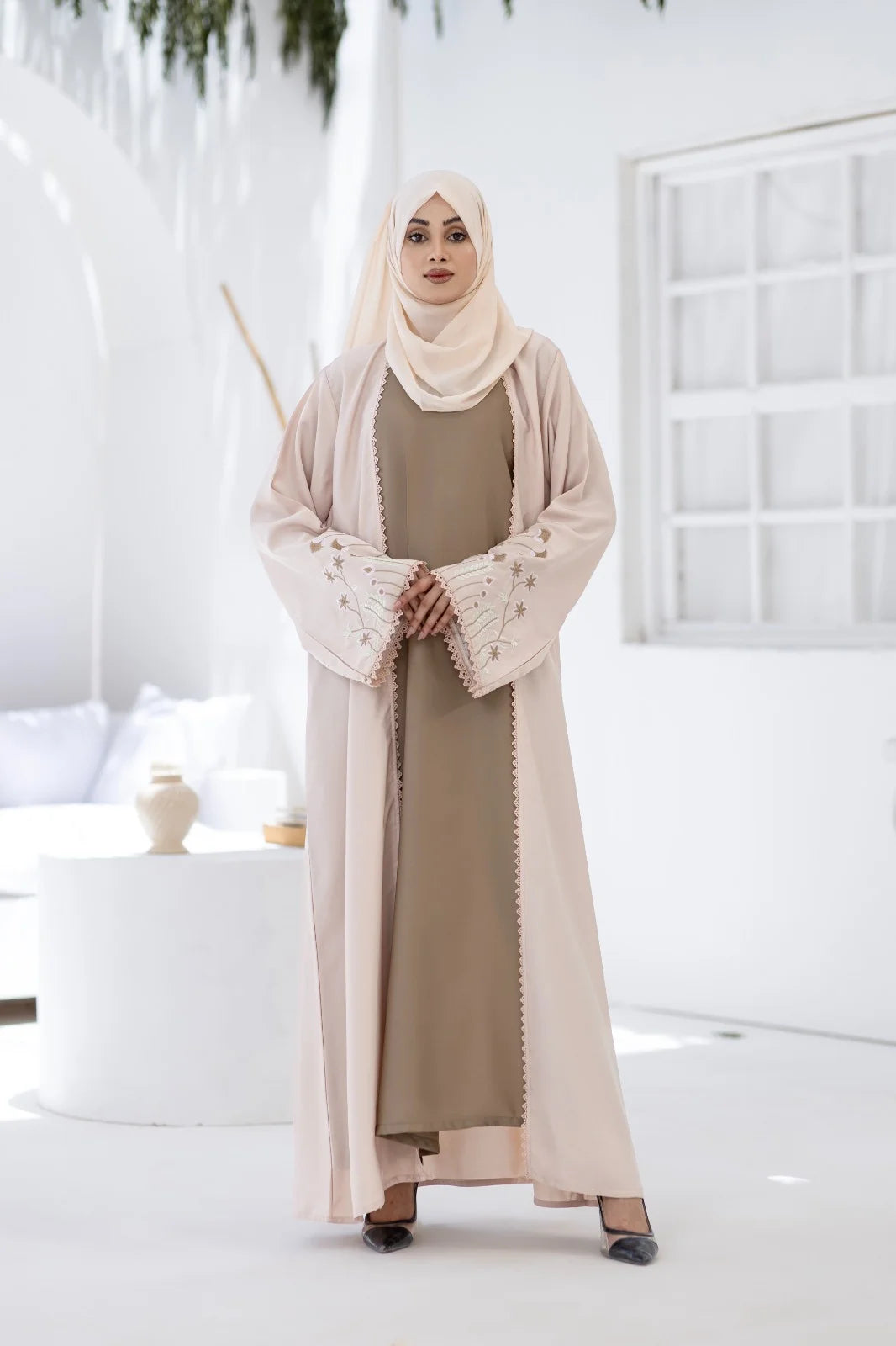 Lyra Abaya: Inner attached abaya with lace on front & embroidery on sleeves. easy to wear with quality fabric.