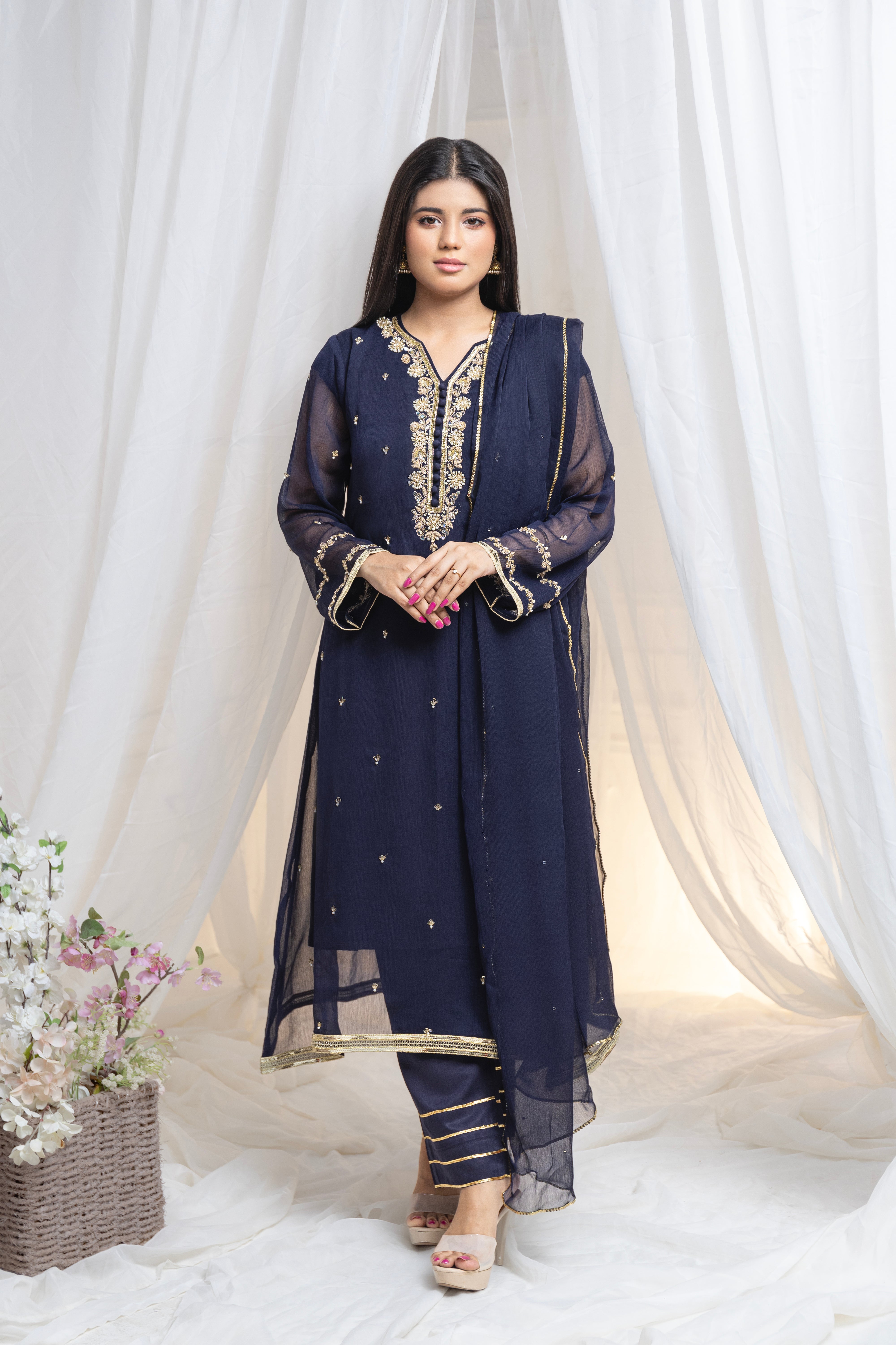 Drape yourself in elegance with our stunning Raag Neela. This beautifully stitched navy blue suit features intricate Kora Dabka and Zari work on the sleeves, combining traditional craftsmanship with modern sophistication. The deep navy blue color symbolizes depth and grace, making it an ideal choice for evening events and special occasions. The exquisite Kora Dabka and Zari embellishments add a touch of luxury and charm, while the premium quality fabric ensures a comfortable and flattering fit. Make a statement of timeless beauty with this exceptional piece.