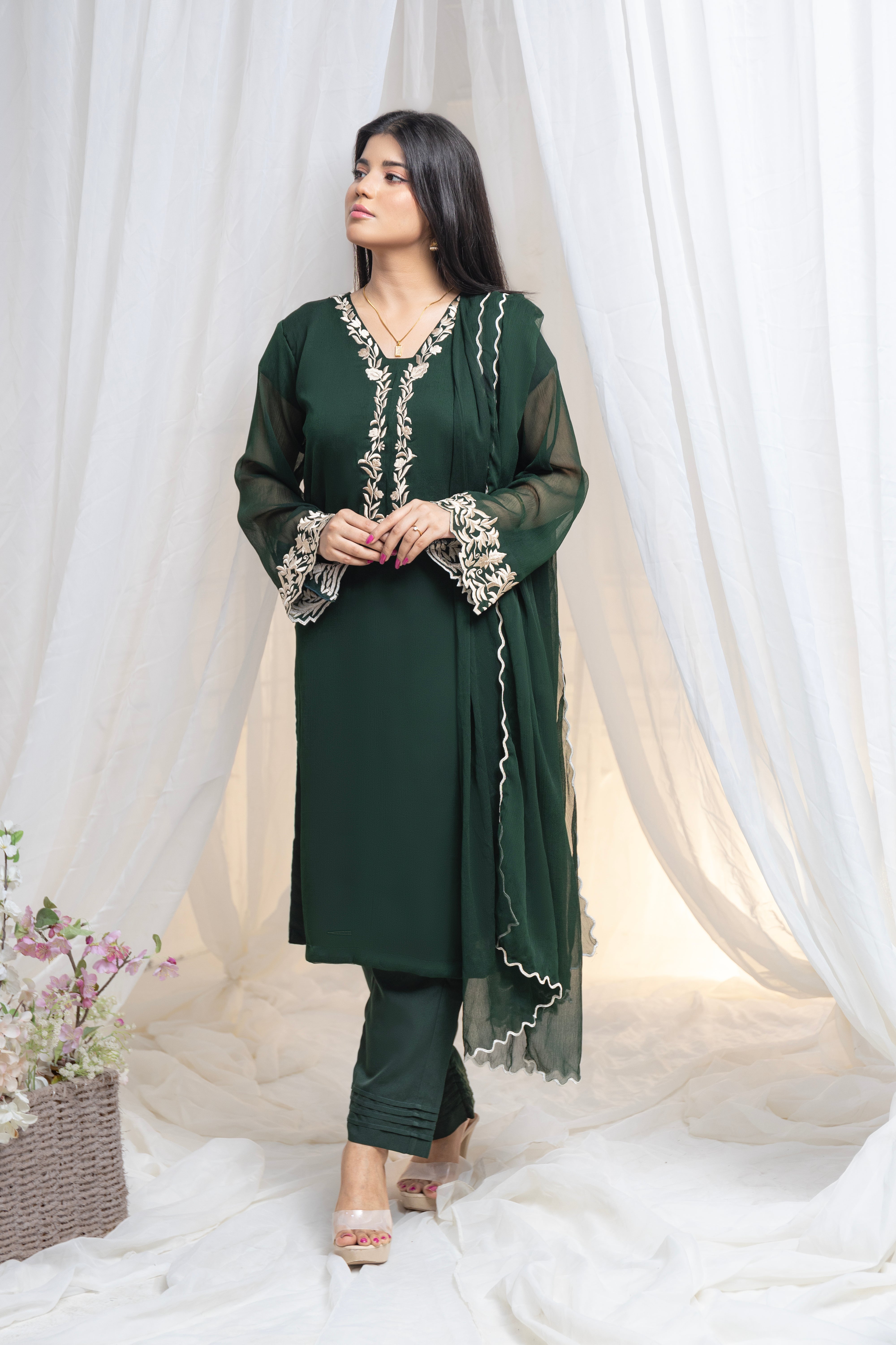 Discover the allure of our Mehraab Resham Kari Jora. This dark green stitched suit is adorned with intricate machine Resham work, including beautiful detailing on the sleeves. The rich dark green color exudes a sense of luxury and sophistication, making it perfect for both festive occasions and formal events. The meticulous Resham embroidery adds a touch of elegance and finesse, while the premium quality fabric ensures comfort and a flattering fit. Elevate your style with this elegant piece that embodies traditional craftsmanship and modern aesthetics.
