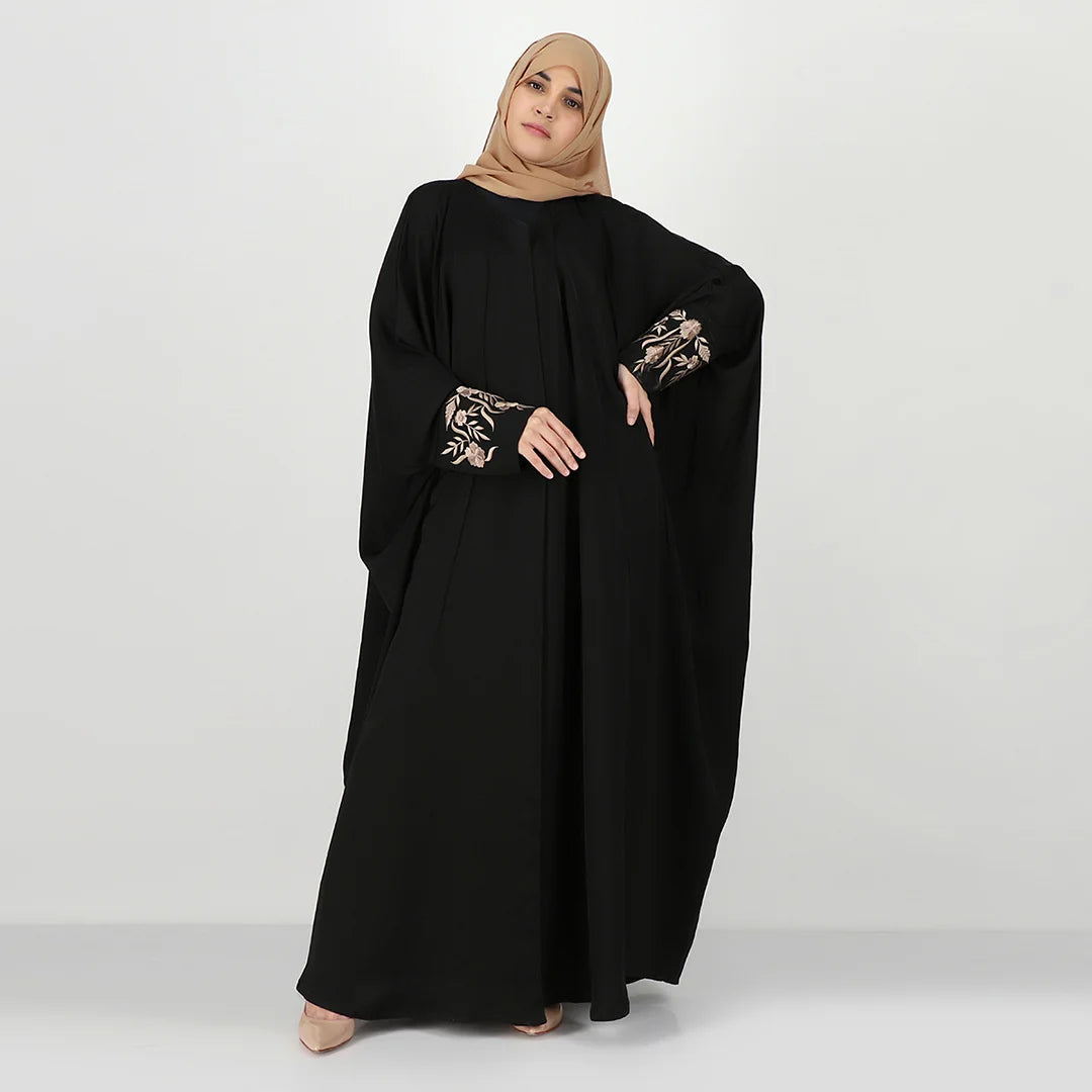 Raena Abaya- Front Open Abaya With Contrast Embroidery & Hijab, Embroidery on sleeves Makes it Beautiful.