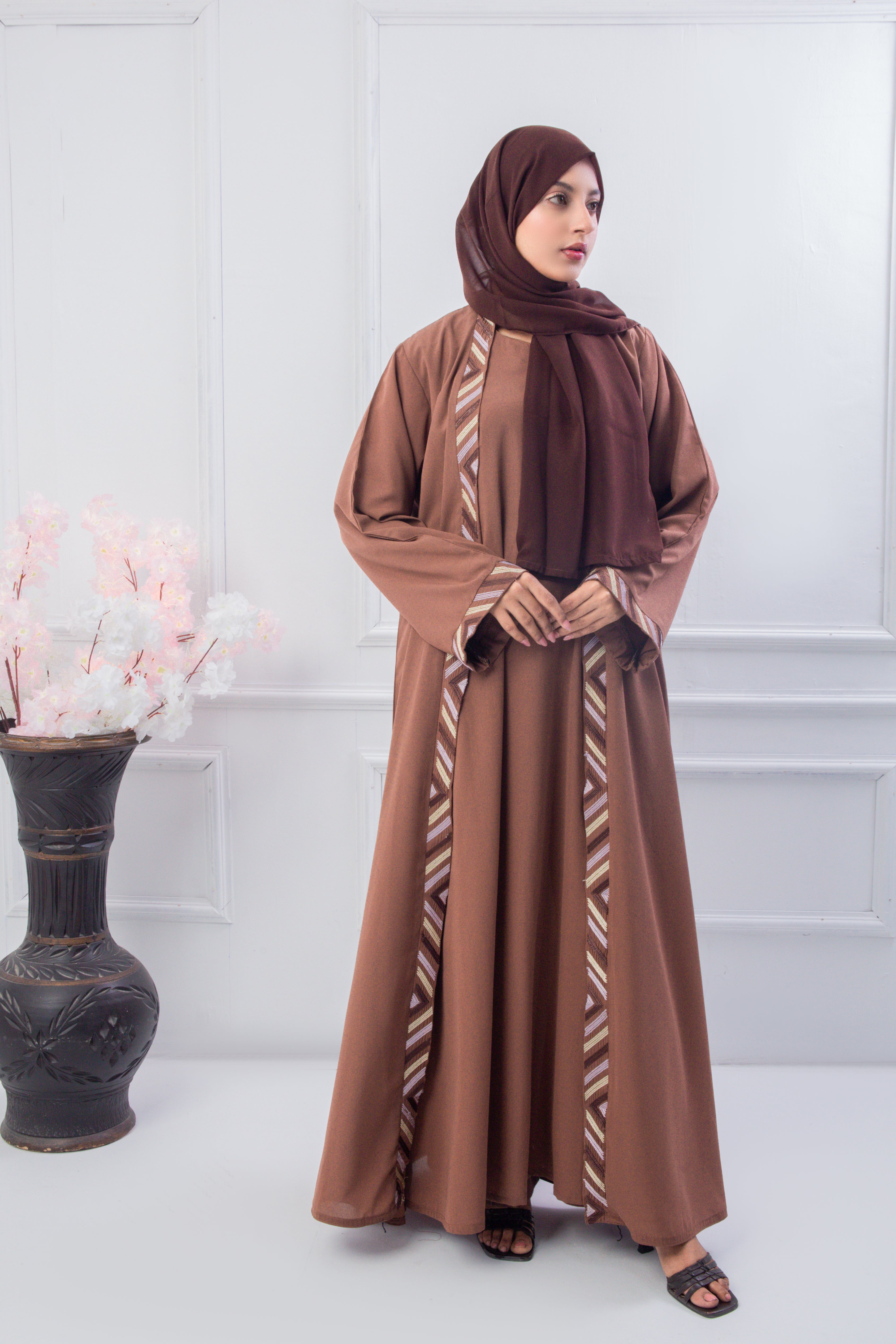 Step into timeless elegance with this beautifully tailored brown abaya, designed with a rich earthy tone and adorned with detailed geometric trim. The vertical embroidered panels add a modern twist while enhancing the abaya’s graceful flow. Perfect for both casual wear and formal gatherings, this piece offers modesty with a refined edge. Crafted from soft, breathable fabric, it ensures all-day comfort without compromising on style. The contrasting patterns provide a unique cultural flair, making this abaya a standout in any wardrobe. Pair it with a matching or contrasting hijab for a complete, polished look that's effortlessly chic and sophisticated.